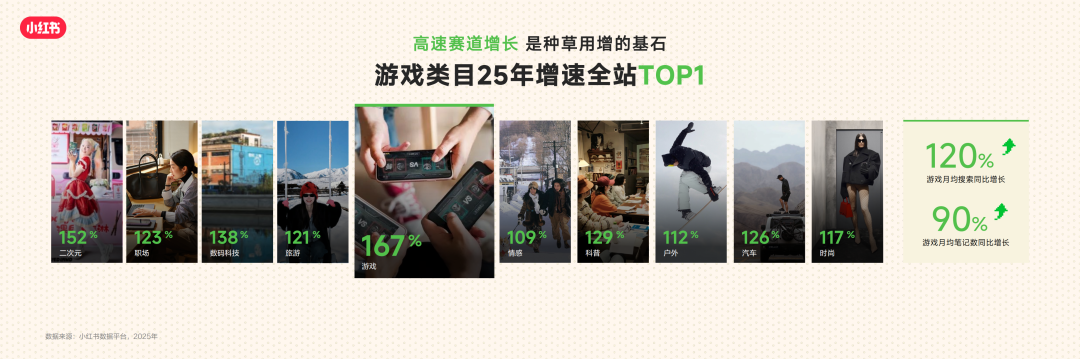 去年小红书游戏赛道增长很快,根据官方在此次游戏行业峰会上公布的数据:小红书游戏大盘2025年内容增长超167%,游戏类目增速为全站TOP1。