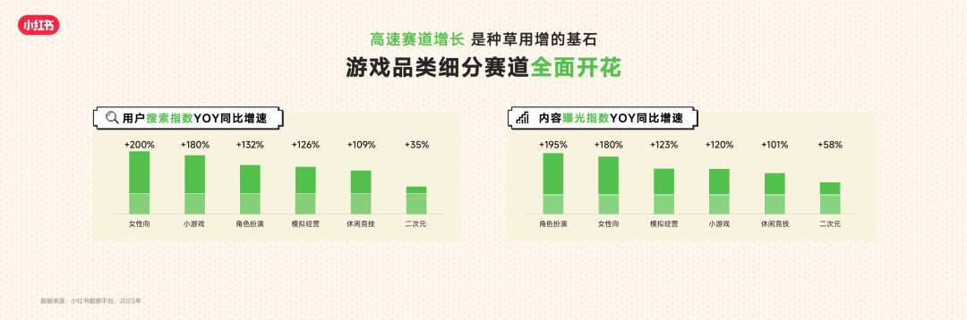 此次峰会,小红书公布了一个数据:细分游戏品类/赛道的搜索与内容曝光都在增长,说明用户不只是在刷游戏内容,也更愿意在小红书主动找游戏内容。