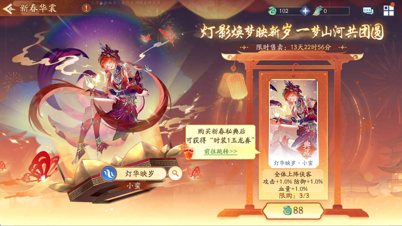服装售价为88玉龙,家人们可通过参与第二部分活动【新春秘典】至尊版,获取时装1玉龙券,1玉龙获取时装