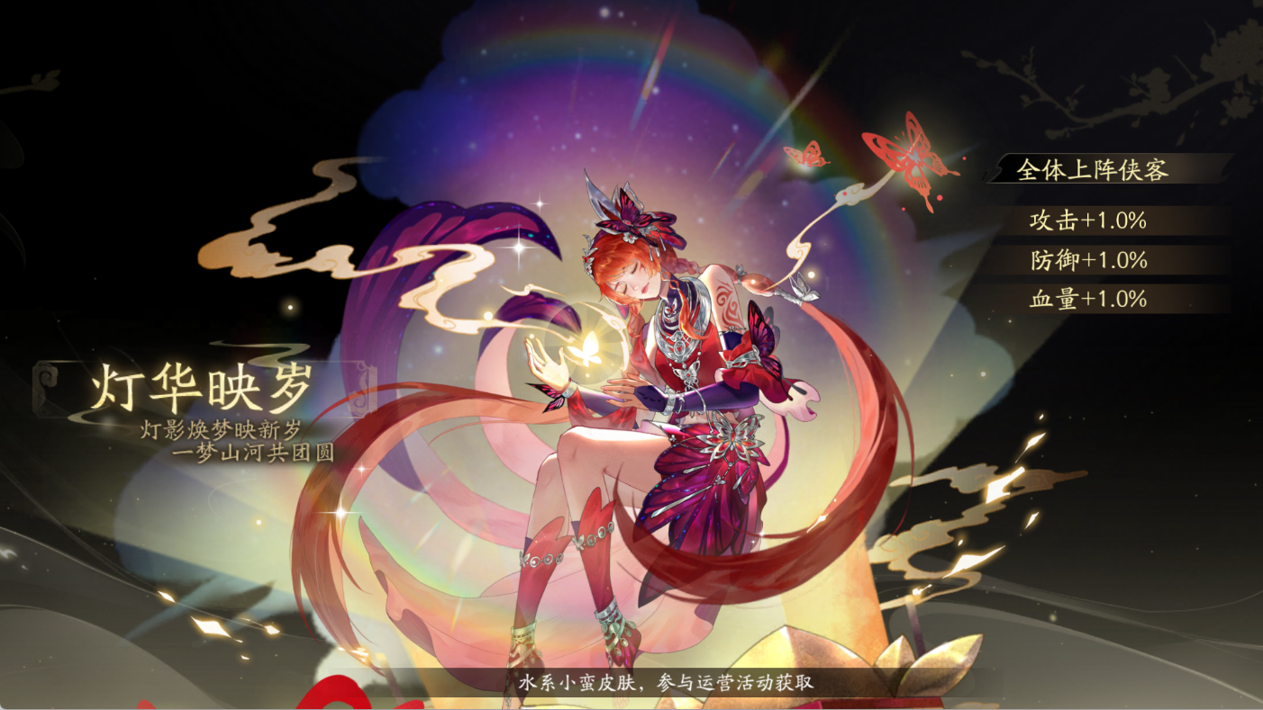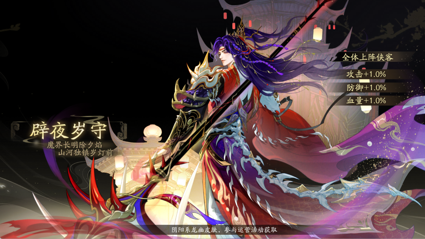 本次活动更新的新皮肤为阴阳(武)侠客——龙幽专属时装——【辟夜岁守】和水珍(法)侠客——小蛮专属时装——灯华映岁