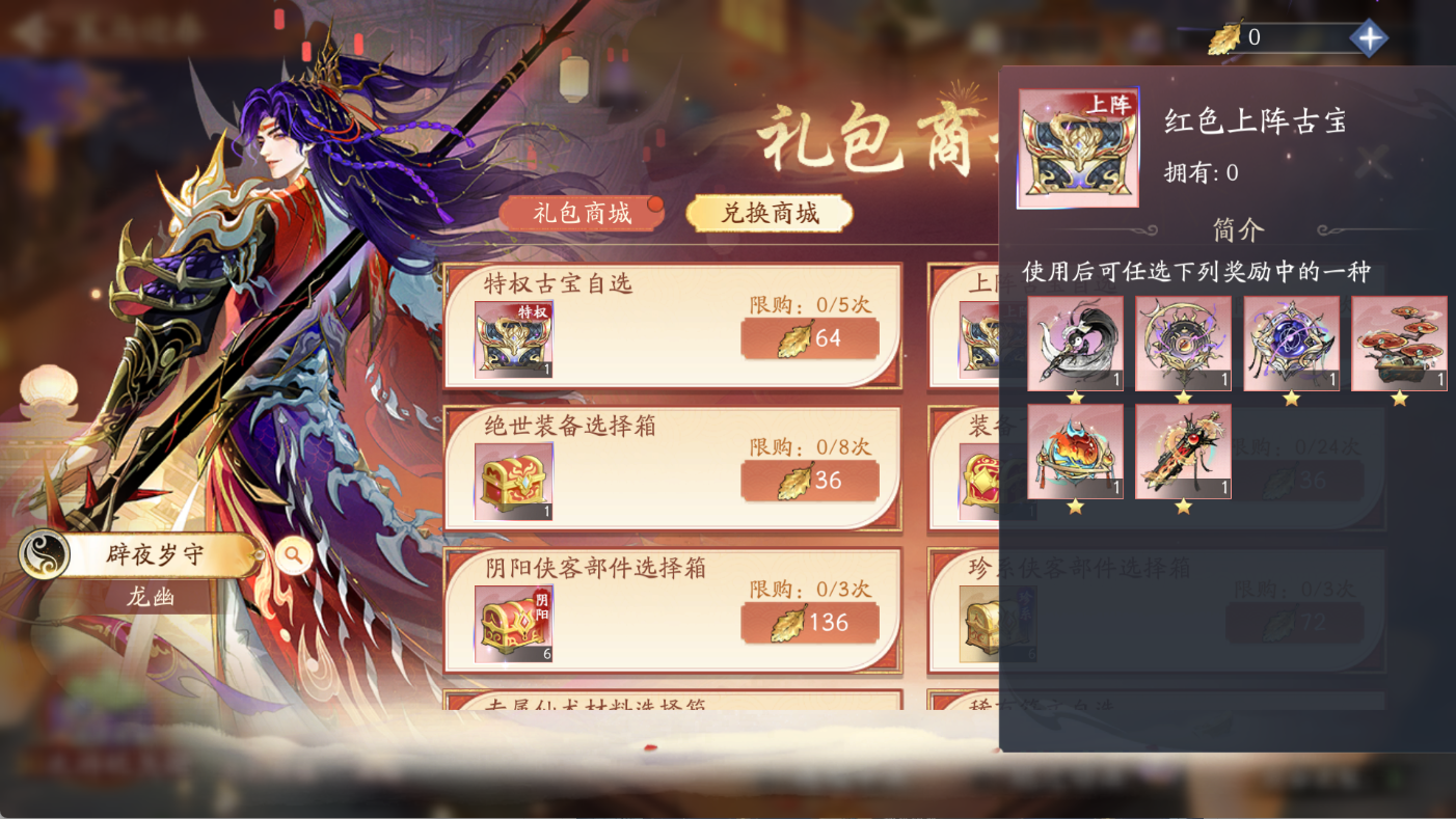 (1)消耗【金叶子】*218,可兑换阴阳(武)侠客——龙幽专属时装——【辟夜岁守】,限购3次