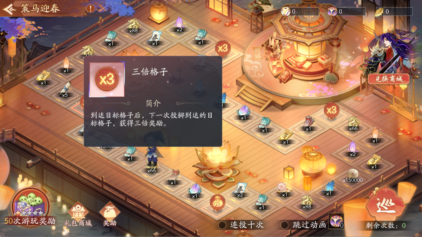 ②三倍格子:到达目标格子后,下一次行动到达的格子获取三倍奖励;