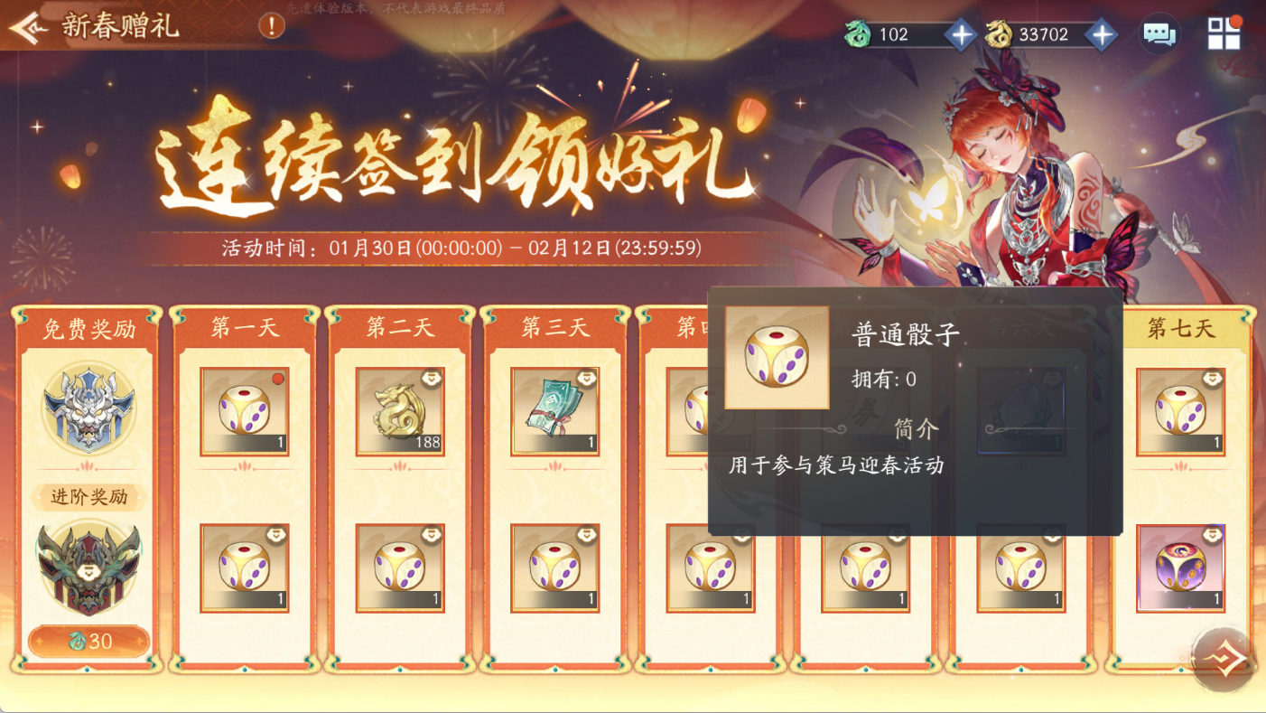 普通玩家可通过签到,获得【普通骰子】*4+其他奖励(金龙*376+祈愿符*2+姑苏券*5+五系招募石*2+新安当票*1+至尊召唤券*1+2026新春活动限定表情)