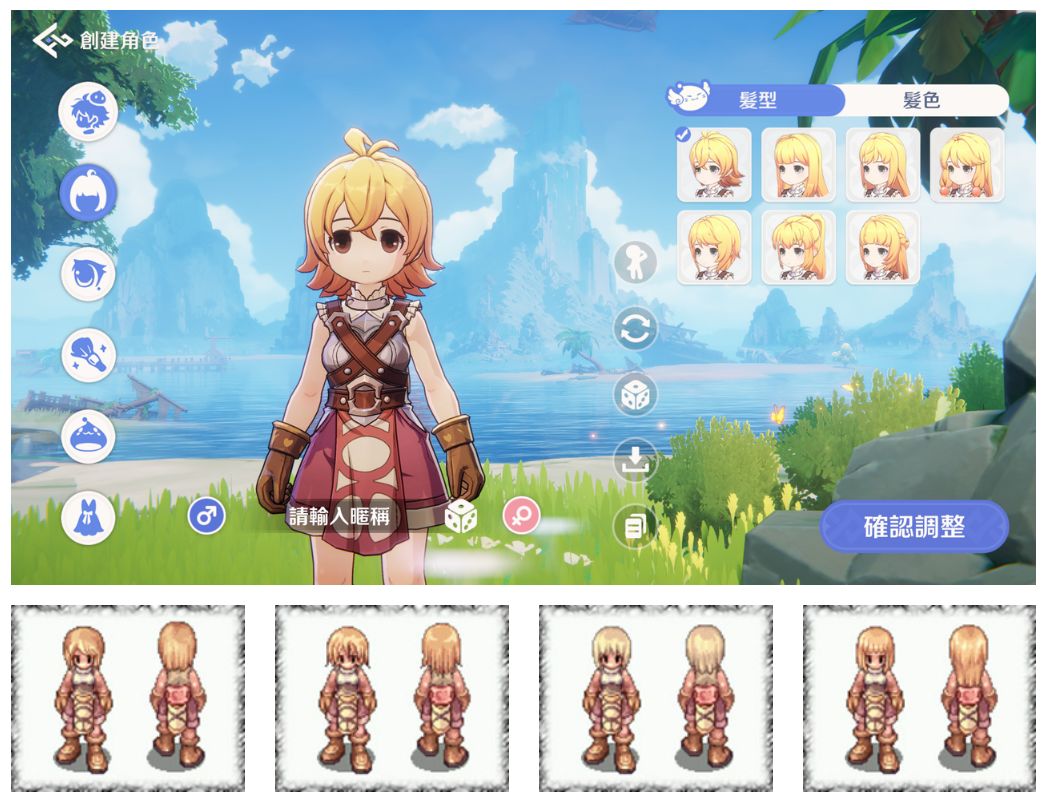 在首次进入游戏后的捏人界面中,就能看到由3D建模技术加持的《RO》系列经典人物画风。可以发现,《世界之旅》在还原《仙境传说》中初始人物基本外观的同时,还在保留其原有风格的基础上改进了许多衣物和面部细节,并添加了更丰富的自定义装扮选项。