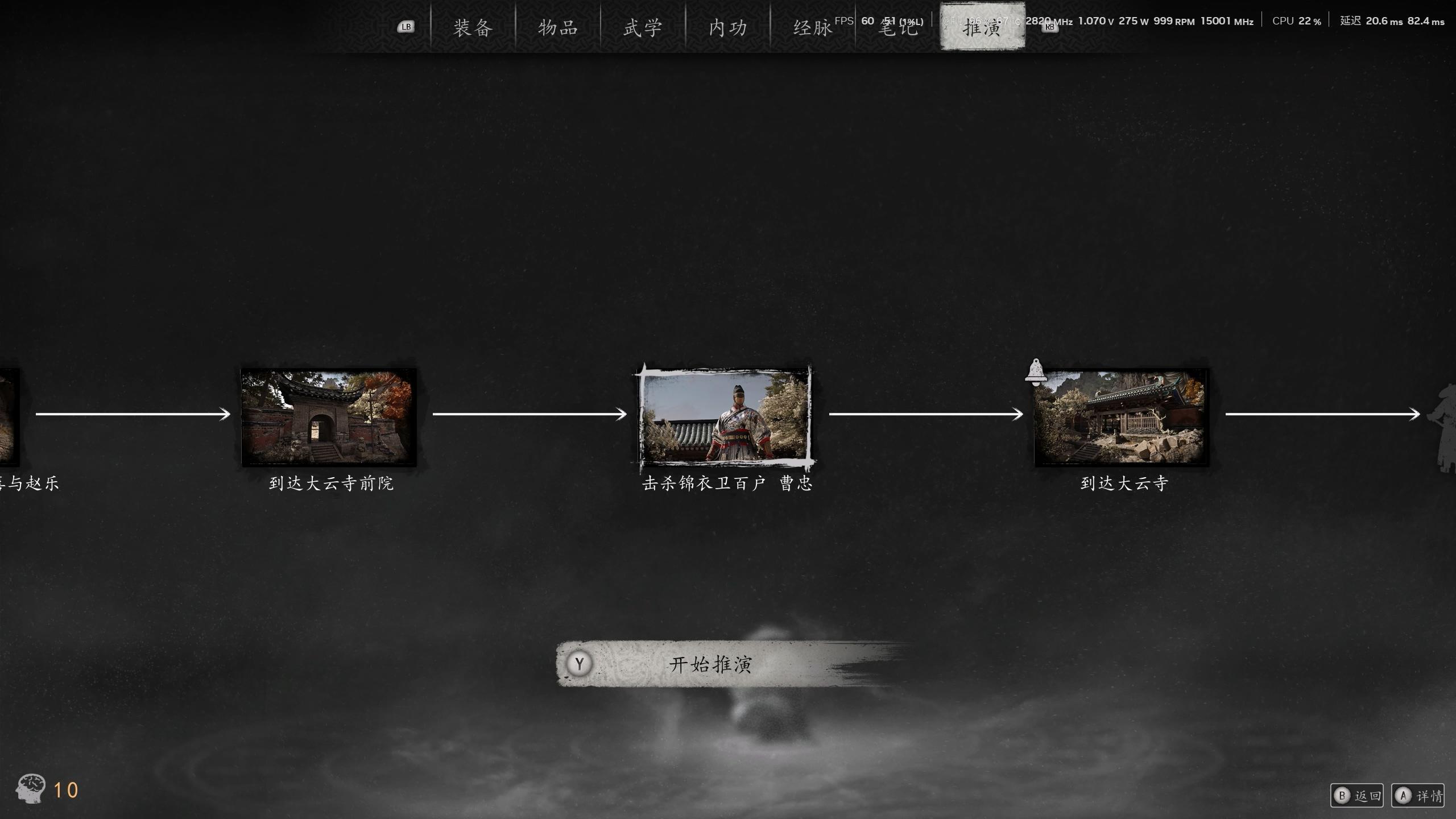 当然这个功能的使用并不是无限制的,回溯到过去的节点需要消耗一种叫做“脑力”的资源,并且能够带回去的道具数量也有限制。在 DEMO 中我一次只能带走 3 件道具,首选强力的武器和防具。不过只要足够有耐心,多回溯几次,也可以将一路上所有装备全都穿在身上去挑战 BOSS,这会让战斗难度明显下降。