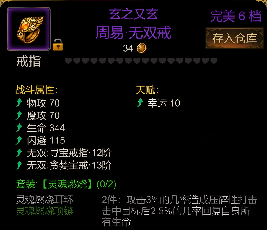 「周易·无双戒」能够以各种套装形态出现,更有机会获得180%属性增强。其特有的无双属性,涵盖了从普通戒指、四大天王装备到八大奇装等各类装备的金色传说属性。当你获得一条“无双”属性时,便意味着你同时承袭了对应装备的金色传说效果。无双戒最多可以同时拥有2条无双属性。