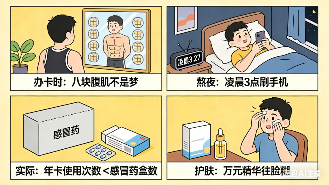 💰 挤牙膏般抠给【健康续航塔】——办年卡时幻想八块腹肌,实际使用次数不如感冒药;熬最深的夜,买最贵的精华,在“修仙”和“修脸”之间仰卧起坐。