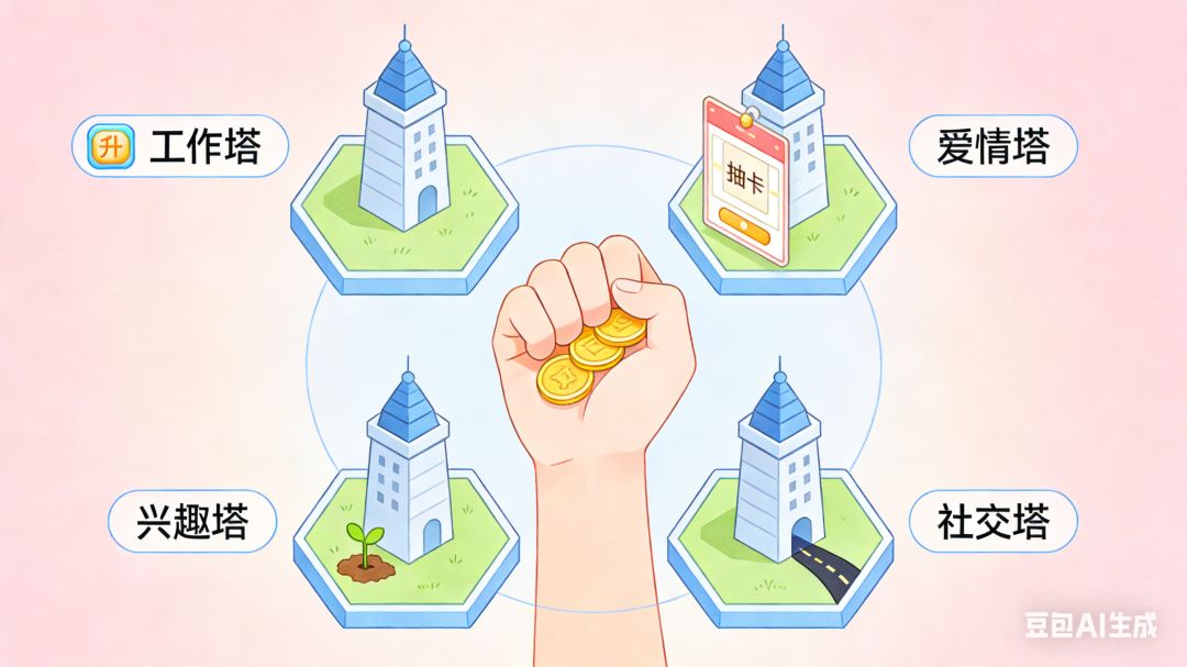 刚开局的青春版本,我们总想当个六边形战士——工作塔点几级,爱情塔抽个卡,兴趣塔种棵苗,社交塔铺条路。手里攥着那点初始金币,觉得未来无限可能,结果第一波现实小怪涌来就慌了阵脚。