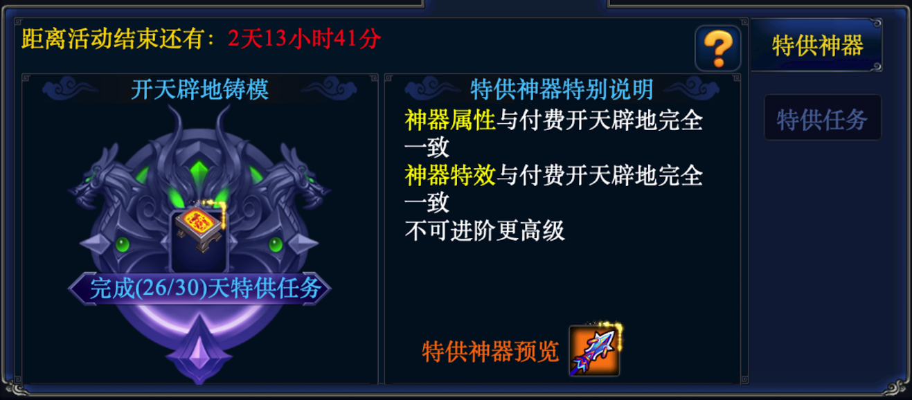 ·【特供神器】:仙道将在创建角色第15天后,开放特供神器活动,完成活动目标送[神器]开天辟地!