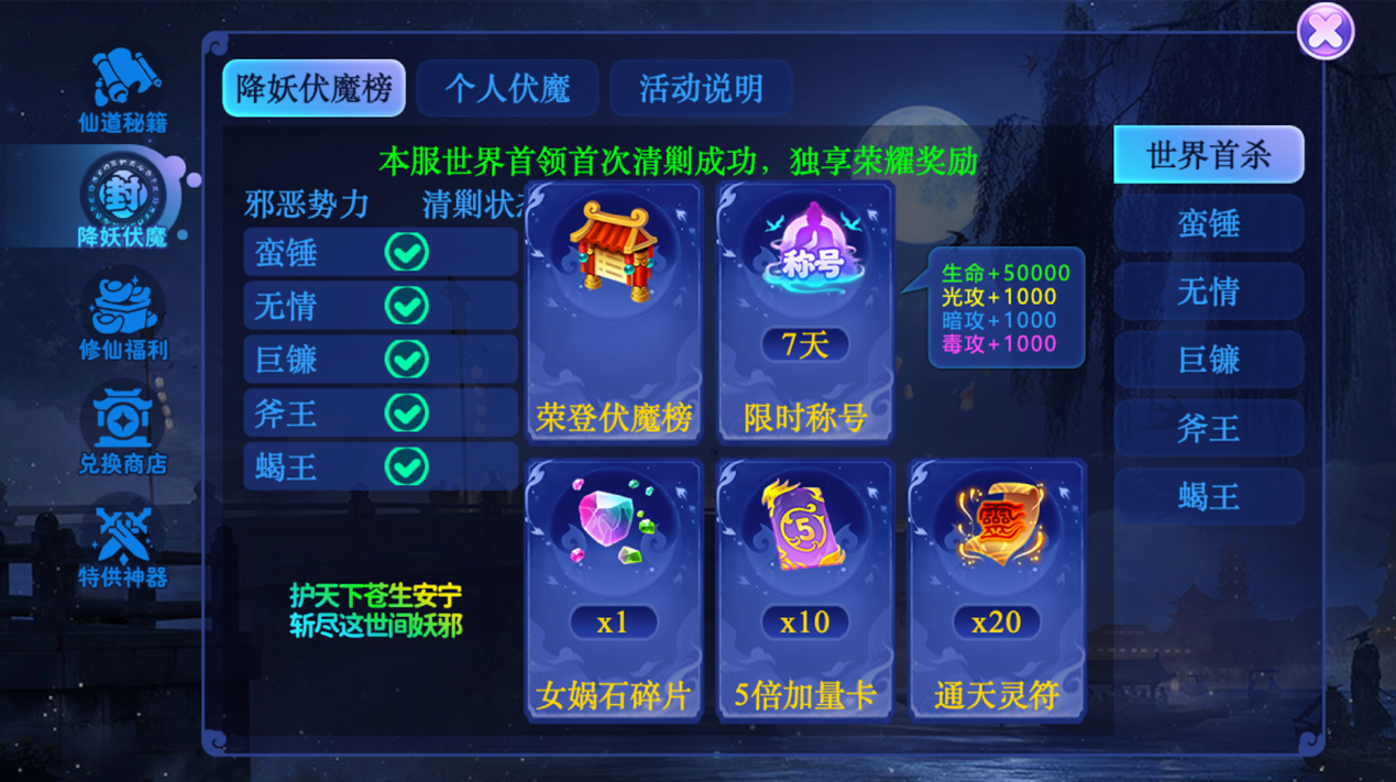 ·【降妖伏魔】:开服后,首次清剿世界首领的归属小队成员将永久展示在本服伏魔榜,还可领取丰厚的首次清剿奖励:超强属性称号、女娲石碎片、5倍加量卡和通天灵符!