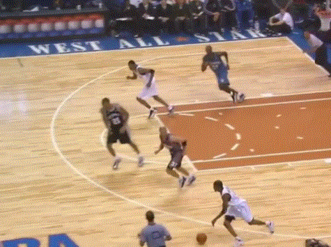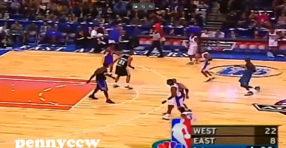 在全明星赛上的一次快攻反击中,艾弗森奋力起跳空中接队友传球,在空中将篮球从左手换到右手,顺势抛投命中,一时之间全场欢呼。