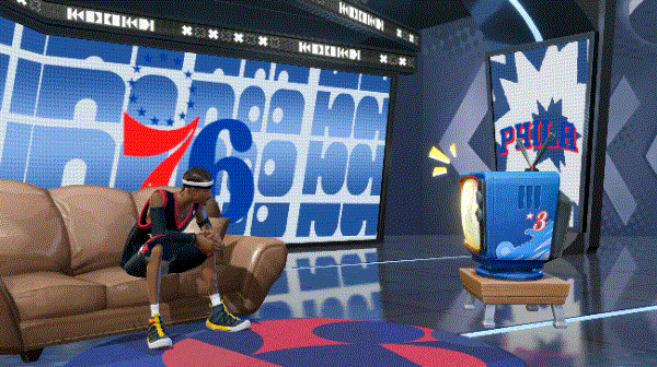 当你选择艾弗森上阵后,在大厅界面,就能看到艾弗森手持那只比自己脑袋还大的球鞋电话,严肃庄重却难掩笑意,嘴角挂着似有似无的调皮笑容,球鞋的颜色、纹路,都和当年的经典镜头无缝衔接。