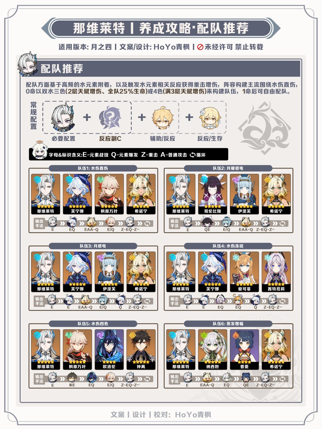 ●那维莱特主要以特殊Z为核心输出,E/Q也在提供资源的同时造成伤害,技能组伤害倍率均与生命值相关,且生命收益接近于增伤收益,同时基于被动天赋的增伤条件,0命队伍构建主要围绕2种思路: