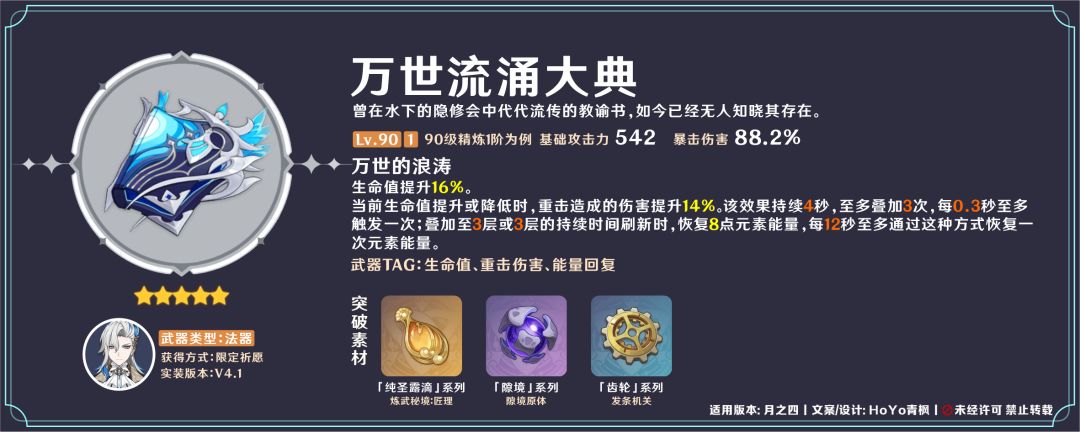 ●专属武器:副属性88.2%高额暴伤,特效提供生命加成、Z增伤、能量回复,回能效果在单水队中相对关键,双水配置中也能降低充能类需求,从而稳定循环手感;