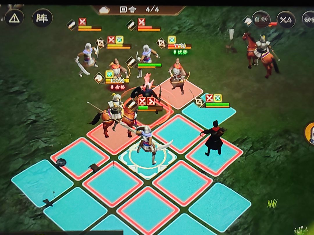本关是三方混战,最终回合需要占领中间红色地块。难度不高,主要避免被夹击导致二打一,同时,让其他两方战斗先开战更好。第一回合,靠近红色地块。第二回合,可以待机一回合,不抢占红色地块。让另外两方先接触开战。第三回合,首先将靠近我方的敌方优先清除,避免堵路。然后将红色地块内敌人打残血。第四回合,干掉红色地块敌人,然后让我方血厚的人上去占领。敌方回合抗住不死即可顺利过关。