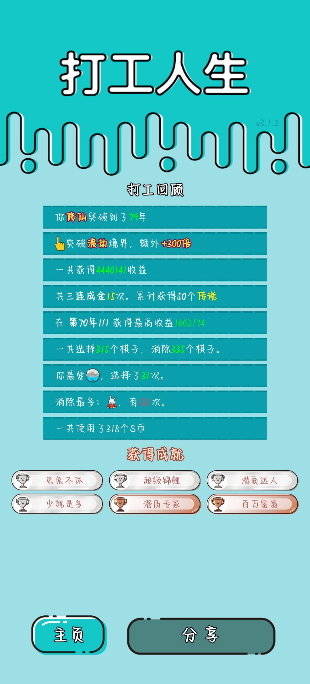 我打工坚持了79年。共获得195205收益。累计获得50个传说棋子。共选择315个棋子,消除335个棋子。我最爱undefined,选择了31次。获得了6个成就!