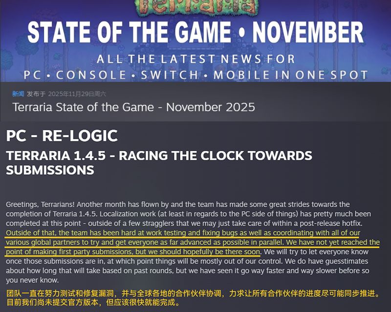和大家一样,“1.4.5版本全球同步更新”的资讯我们也是从2025年11月29日官方Steam Post中被告知的。