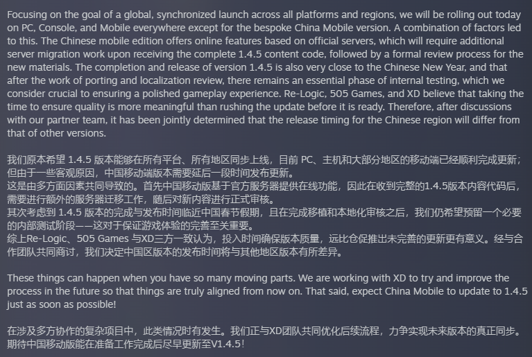 再次向每一位关注、喜爱泰拉瑞亚世界的大家表示我们的歉意。