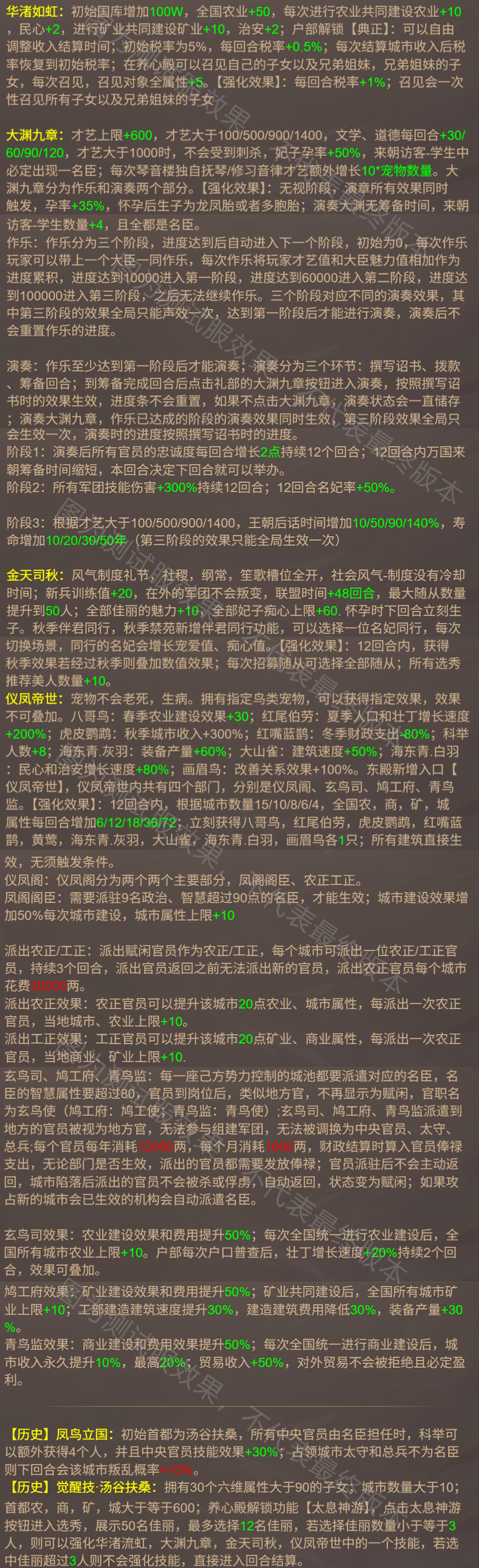 少昊的技能与“音律”和“才艺”深深绑定。极高的才艺修为不仅能吸引名臣来投,更能演化出治国安邦的宏大乐章。作为乐圣,在精心创作与筹备后,您能举办震撼天下的演奏盛典。它不仅可提振百官忠诚,加速万国来朝的进程,在特定时期内,它甚至让我方军团获得如神助般的战斗加成,或为王朝延绵国祚与您自身的寿命。