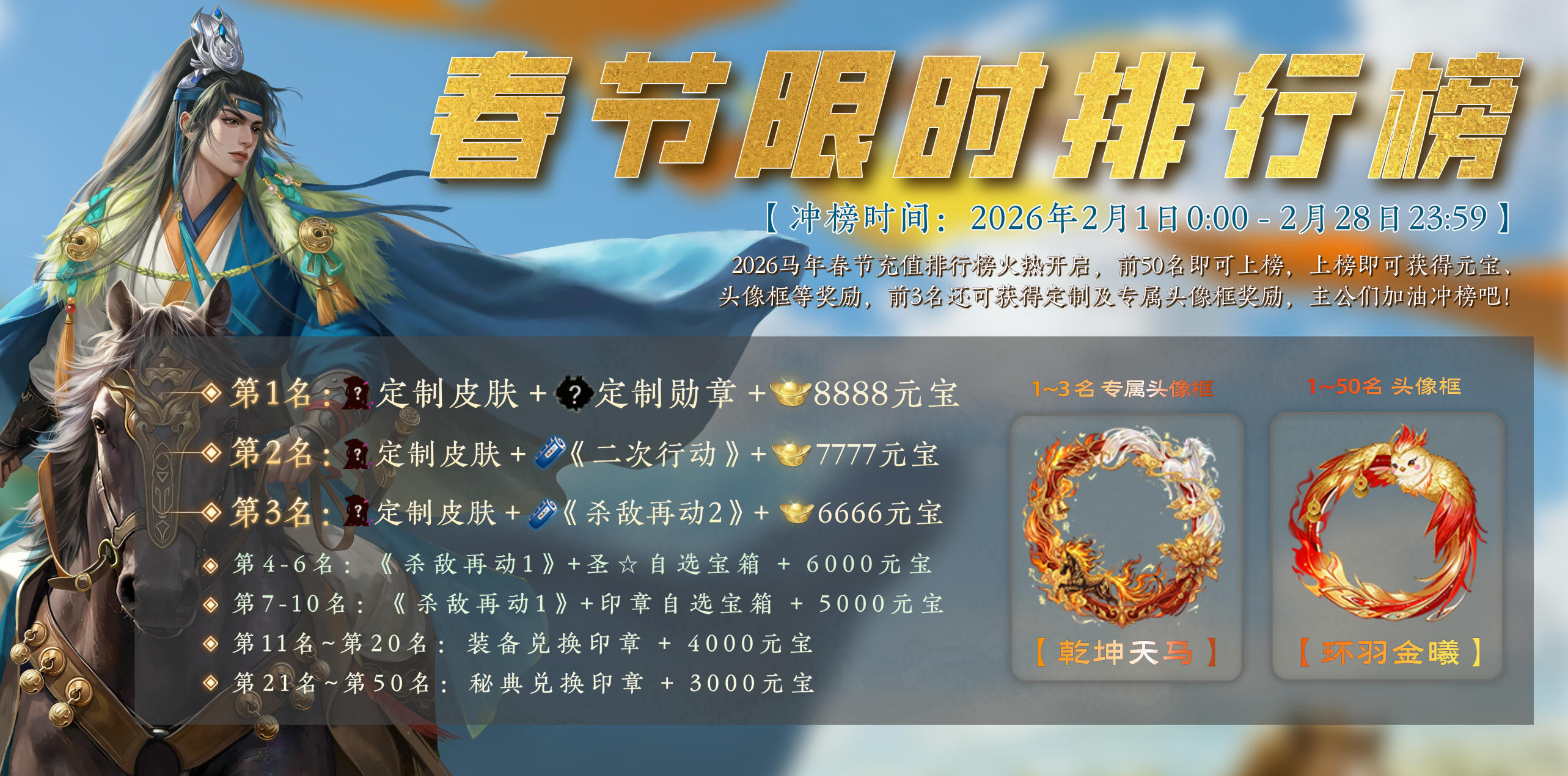 马年春节充值排行榜火热开启,上榜即领豪华奖励,前3名尊享定制福利!