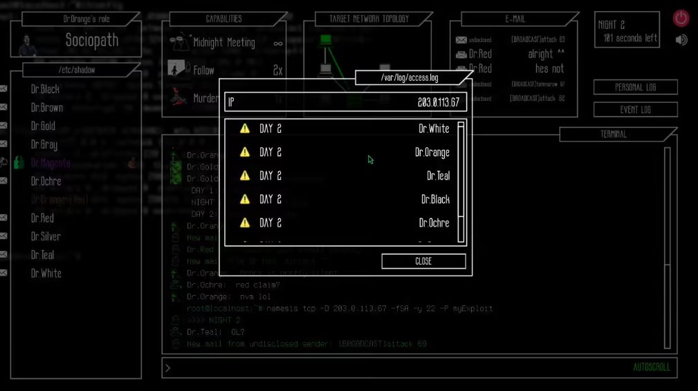 Steam上线新一波喜加一福利,开发者Andrea Alessi旗下原价22元的黑客狼人杀文字冒险游戏《Untrusted》开启限时免费,玩家需在北京时间2月2日凌晨1点前完成领取。本作支持10-16人联机,玩法类似《鹅鸭杀》,以黑客攻防为核心,设有黑客、卧底两大阵营和中立角色。游戏采用终端机风格界面,拥有27种职业、超百种技能组合,玩家需分析服务器日志等线索展开身份博弈。