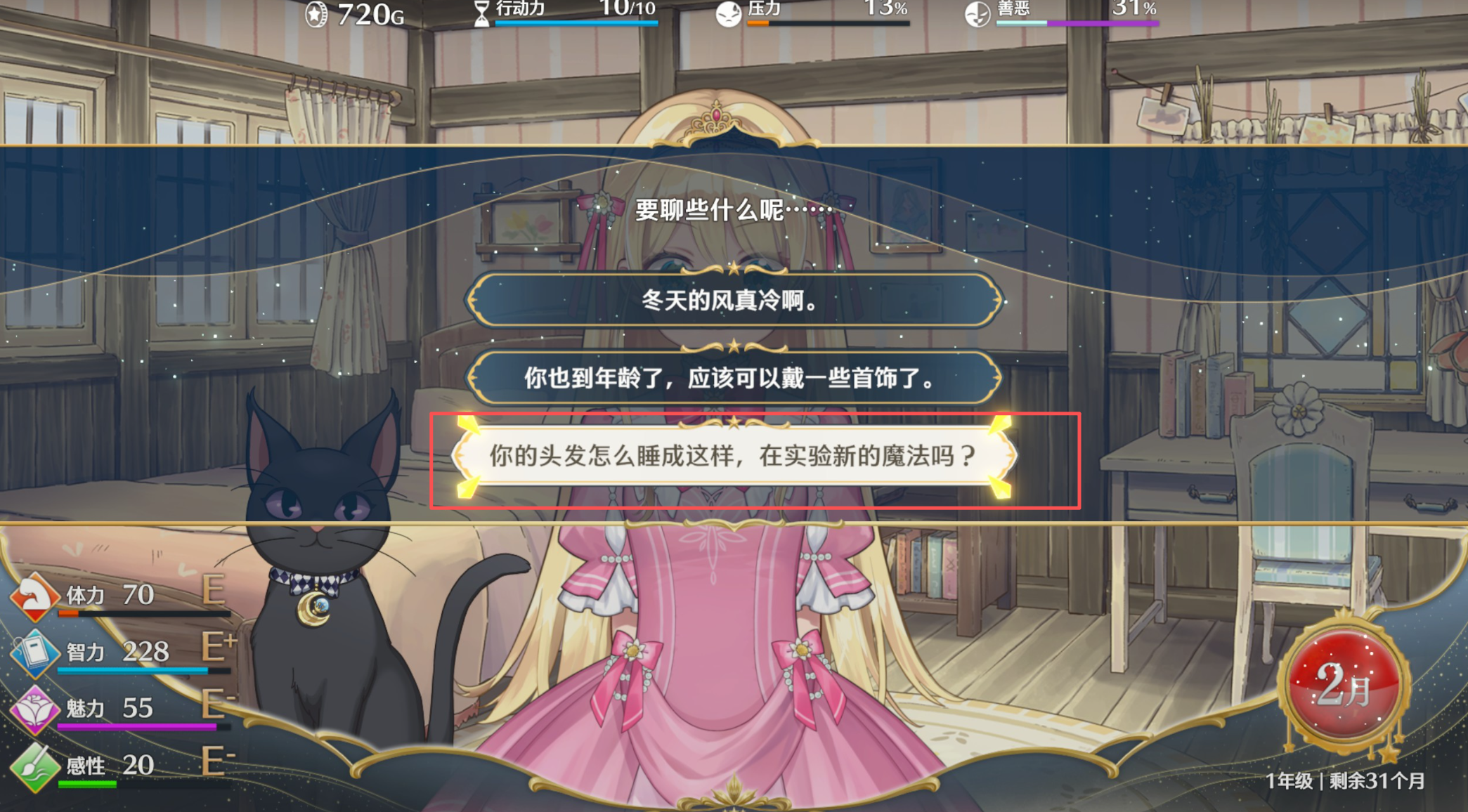 《梦幻魔法公主》与其他游戏一样,设有压力值系统。打工、学习或日常对话选项,都会直接影响女儿的压力值增长。