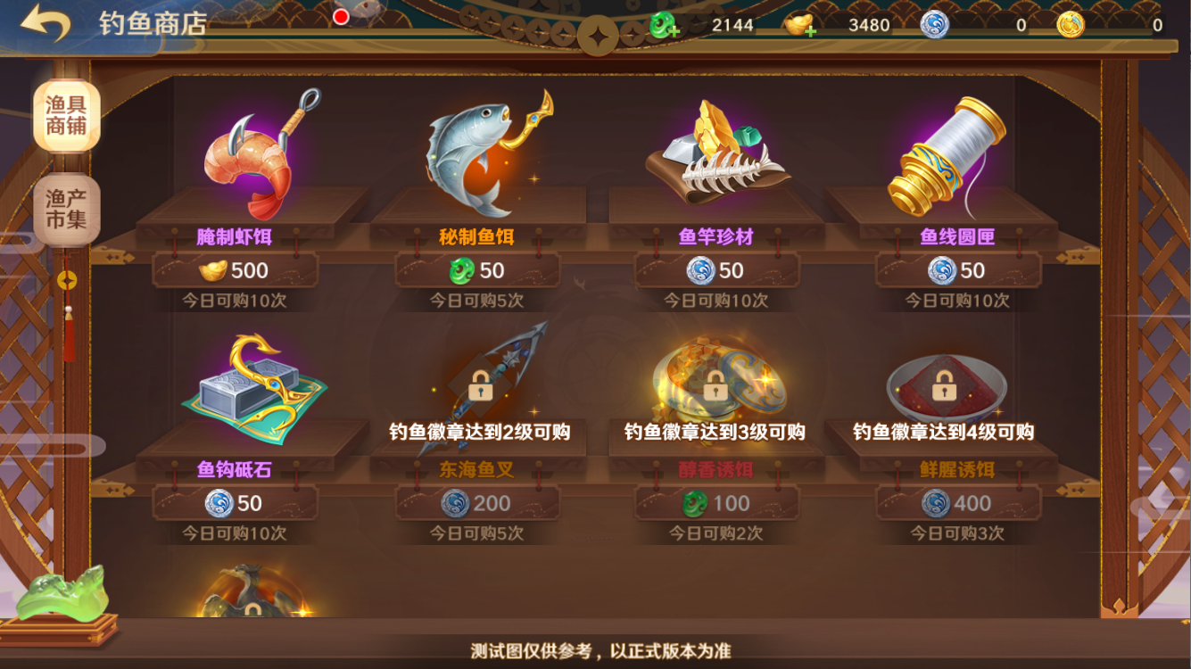 守护使可以使用垂钓后获得的金鳞、银鳞鱼筹,来在此处兑换多种道具。在渔具商铺分页,守护使能使用银鳞鱼筹兑换鱼竿强化材料和渔场道具,随着钓鱼徽章等级提升,这里也会逐渐解锁更多道具,部分道具需要使用仙玉才能入手。此外,守护使还能使用元宝和仙玉购买鱼饵,从而在渔场继续垂钓。