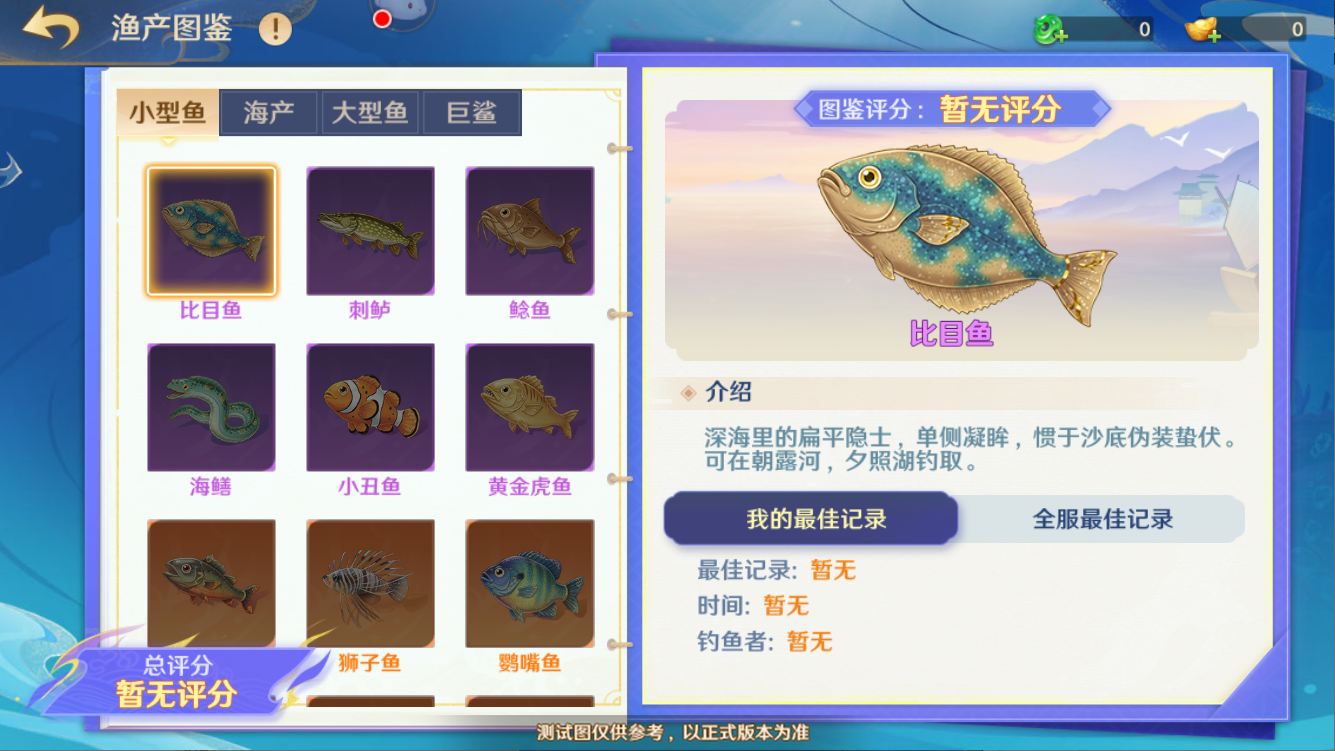 守护使收获的每一种渔产都会被收录进入渔产图鉴,并会显示获得该渔产最大重量个体时的相关记录。此外,每种收录的渔产都会产出对应的图鉴评分,守护使可在此处确认各类渔产的评分与总评分。