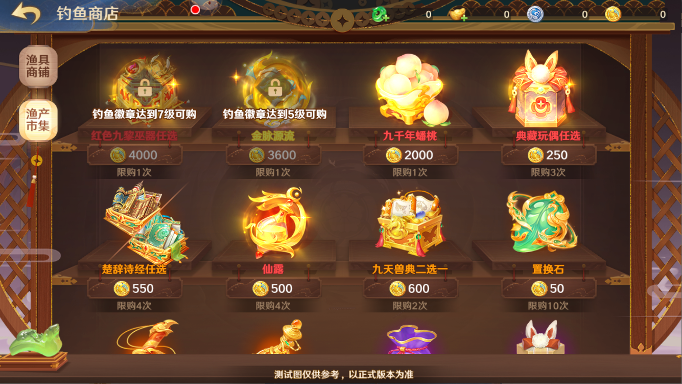 在渔产市集分页,守护使可以使用金鳞鱼筹兑换九千年蟠桃、典藏玩偶任选、楚辞诗经任选、九天兽典二选一等道具奖励。当钓鱼徽章达到5级、7级时,商店还将分别解锁红将升金道具金脉源流和红色九黎巫器任选供守护使兑换~