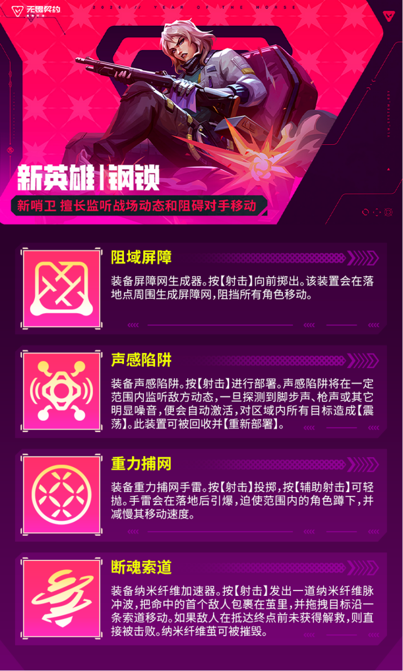 随着瓦手新春版本“马力全开”内容陆续揭晓,各位亲爱的瓦友们,是不是已经对新版本期待满满了呢?本次更新不仅将推出新英雄【钢锁】、新地图【日落之城】、全新通行证,还有一系列趣味活动与娱乐模式等你来玩!