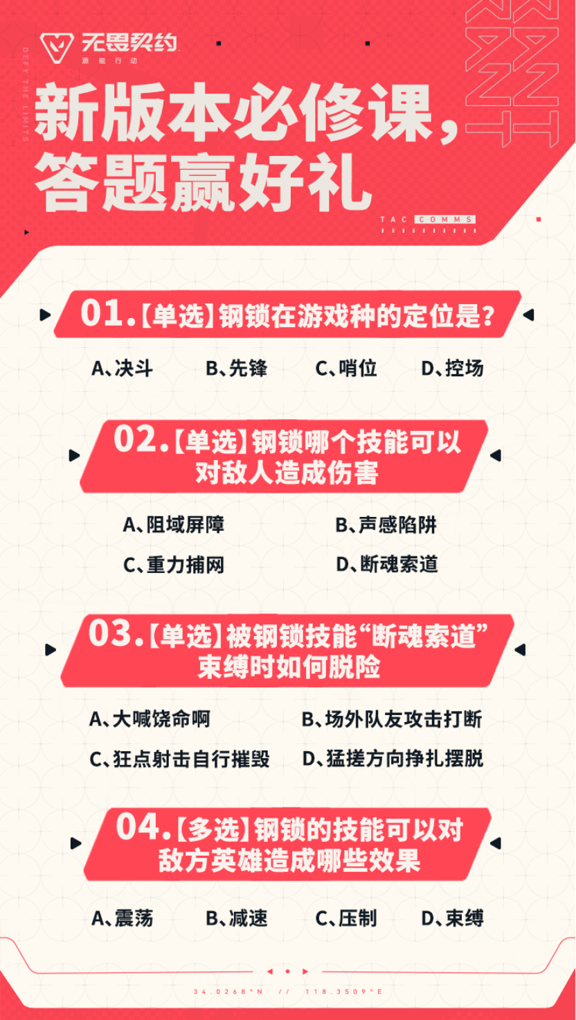 巩固学习成果的时间到啦!以下将有几个关于新英雄【钢锁】的随堂小测试,欢迎在评论区留下你的答案~答对就有机会获得我们准备的专属好礼!参与方式也非常简单,快来评论区留下你的答案吧~