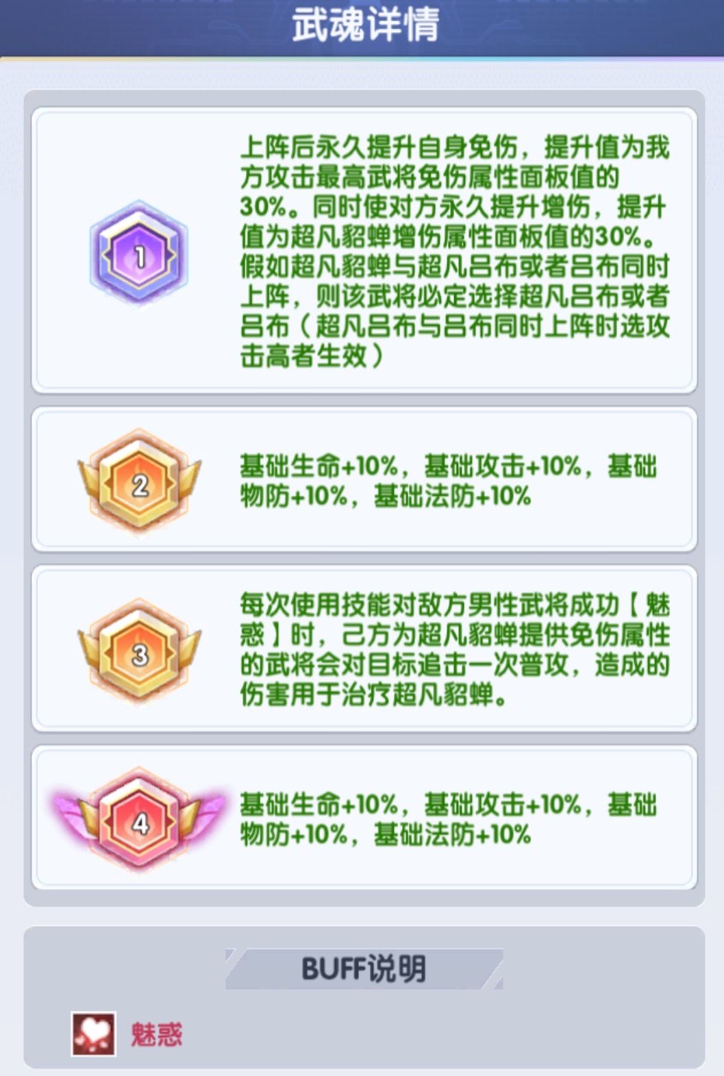 武魂1:超凡貂蝉可获得己方攻击最高武将30%的免伤面板属性,同时该武将可获得貂蝉30%的增伤面板属性(面板属性即武将属性详情中显示的基础数值,详见下图)。需注意,若阵容中上阵吕布,即便吕布并非己方攻击最高武将,该效果也会优先作用于吕布。