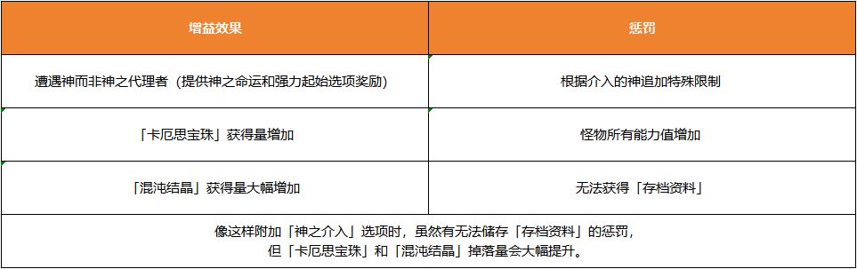 核心特性:惩罚较大,但「存档资料」上限提升至 15 阶级,有概率解锁「神之介入」等独特选项「神之介入」效果说明如下:
