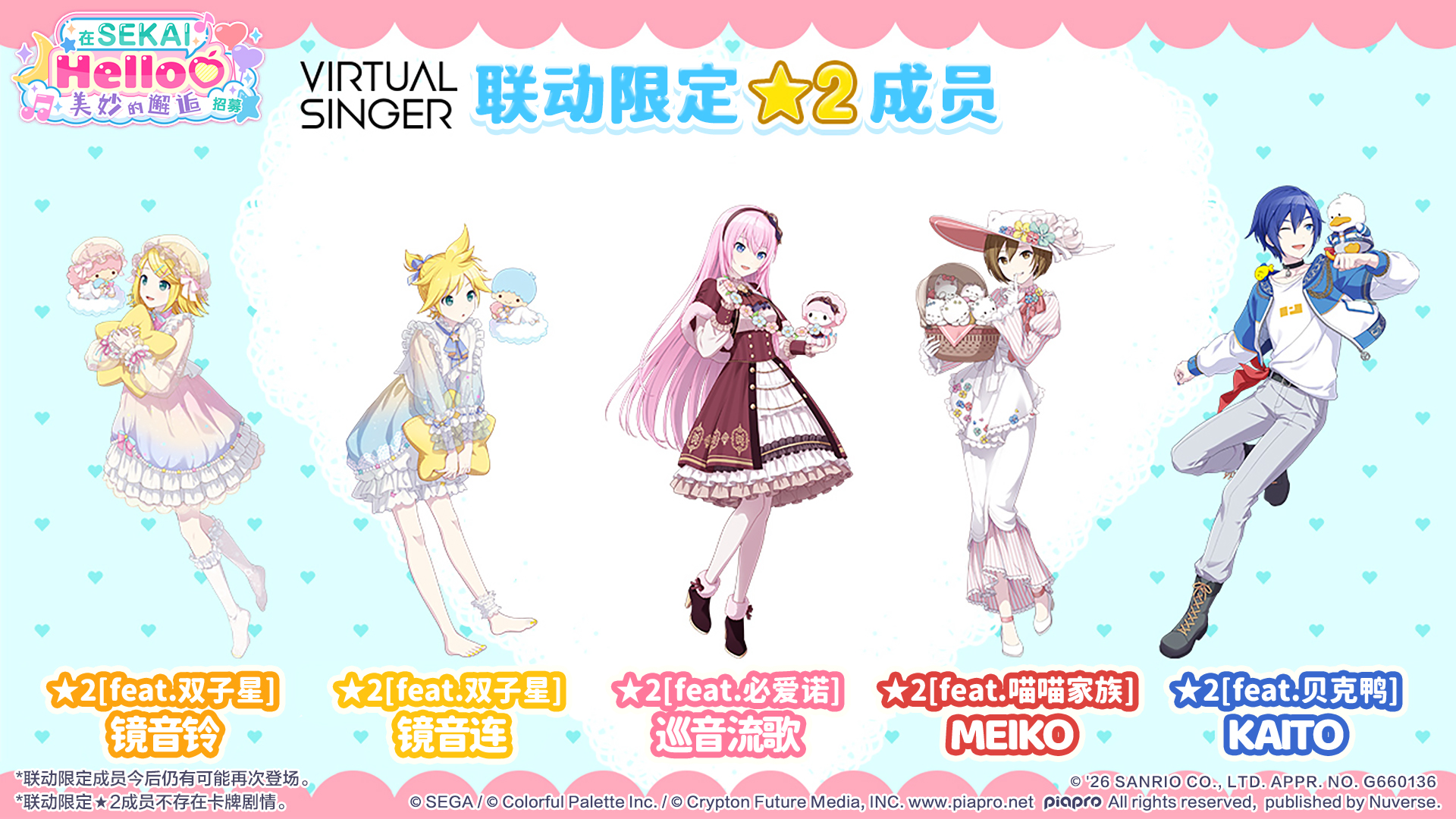 我们将于2/7 12:00起举办[初音未来:缤纷舞台×三丽鸥家族]联动纪念「在「SEKAI」Hello♡美妙的邂逅 招募」🎀