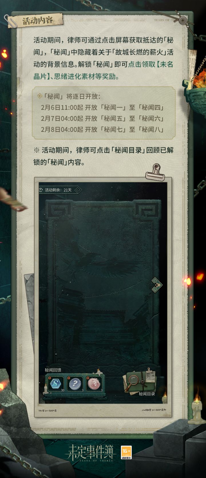 活动期间,律师可通过点击屏幕获取抵达的「秘闻」,「秘闻」中隐藏着关于「故城长燃的薪火」活动的背景信息。解锁「秘闻」即可点击领取【未名晶片】、思绪进化素材等奖励。