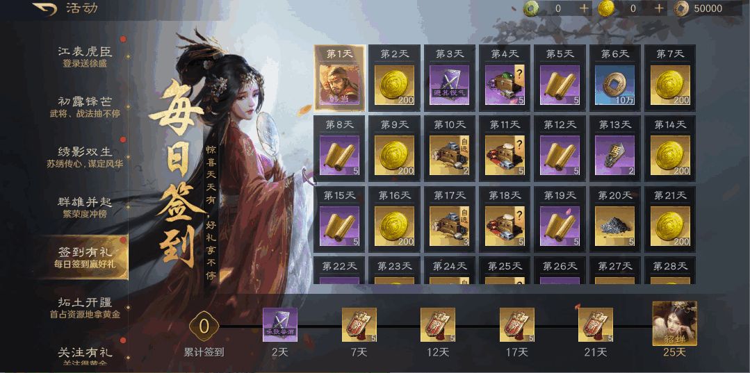 TOP 1:《三国:谋定天下》——寒假长线养成,零氪也能轻松当大佬要说寒假最适合“躺玩”的游戏,《三国:谋定天下》绝对是首选。我们发现,这款游戏把“新人友好”做到了极致:创建角色就能领到强力橙将徐盛和大量启动资源,跟着剧情推到第六章,治疗神将蔡文姬直接到手;七日狂欢活动更夸张,第二天送孙策,累计能领125抽和2480黄金,加上签到解锁的貂蝉,初期阵容直接成型,完全不用为“抽不到强力武将”发愁。