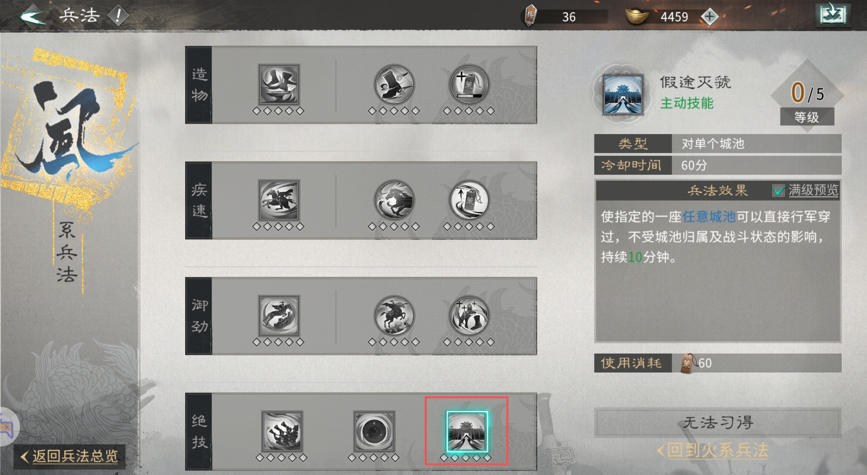 该技能可配合使用风系兵法绝技【假途灭虢】使用,使我方攻城车能够无视敌方阻碍、长驱直入,迅速填满敌方进攻路线上的关键城池,从而有效延缓其整体进攻节奏。