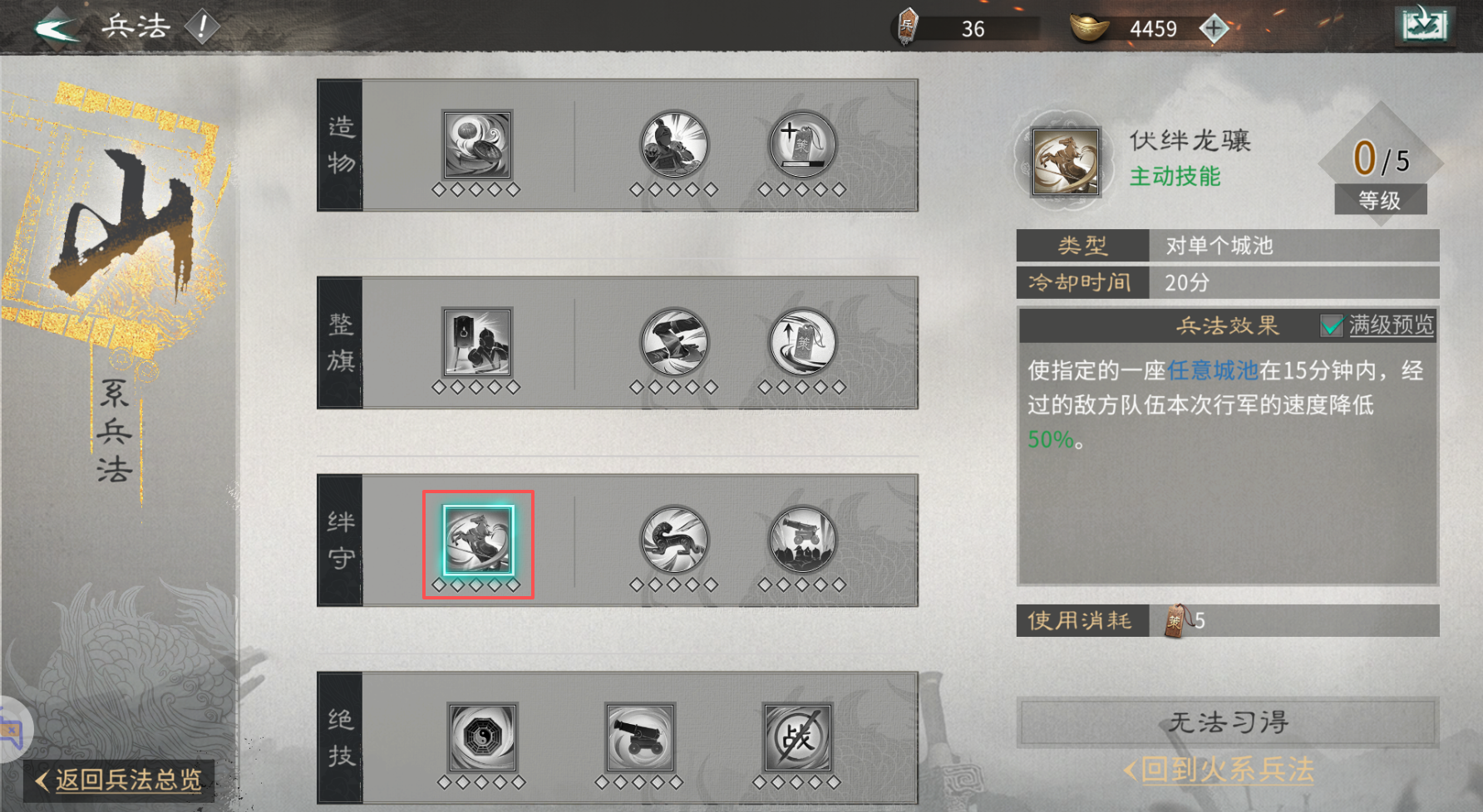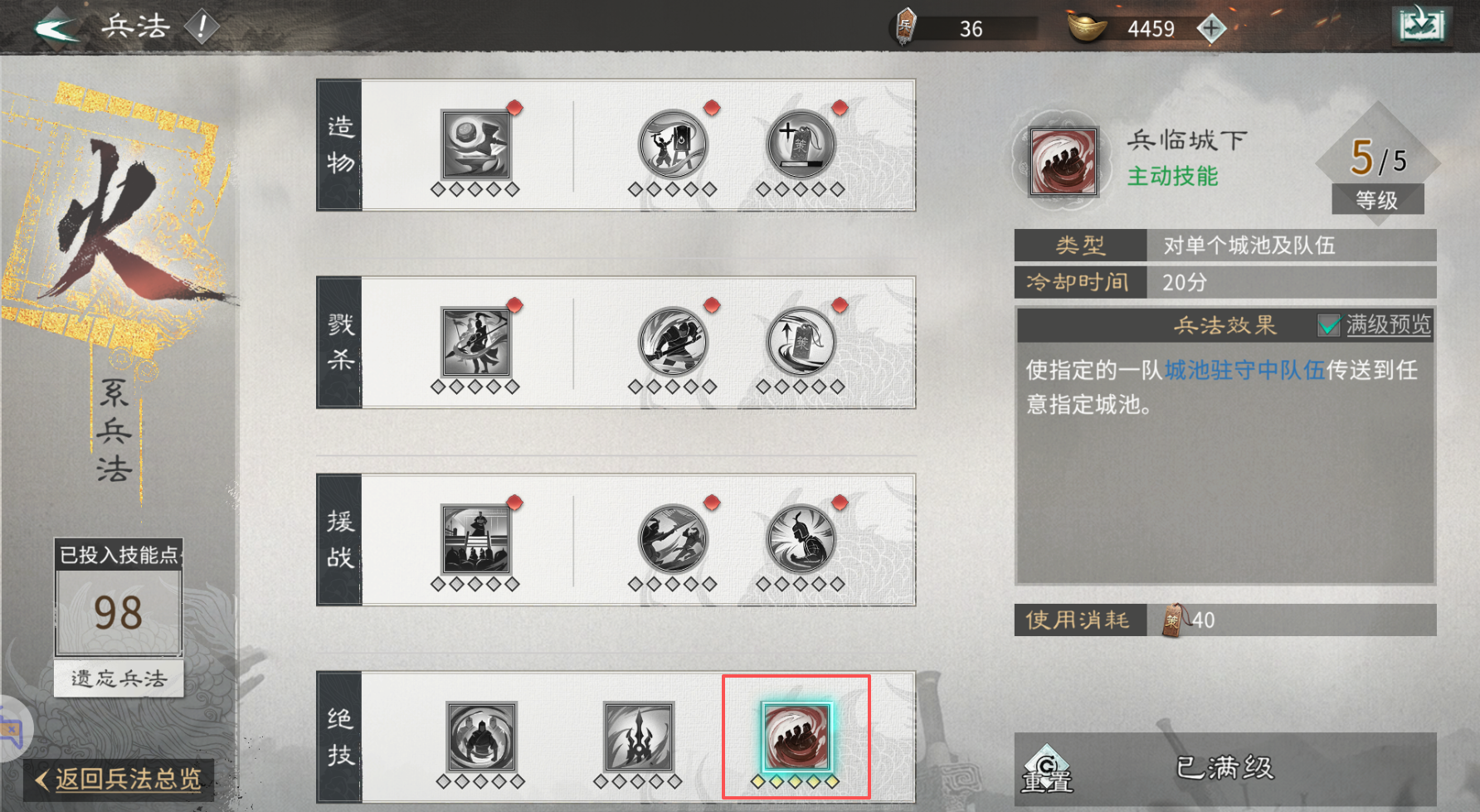 4.若队伍间配合娴熟,可在开局使用火系兵法绝技【兵临城下】,直接传送至敌对阵营出口附近的城池。迅速攻占该城后,立即由另一名盟友施放木系兵法绝技 【独木成林】,对敌方出口实施长达5分钟的封锁。