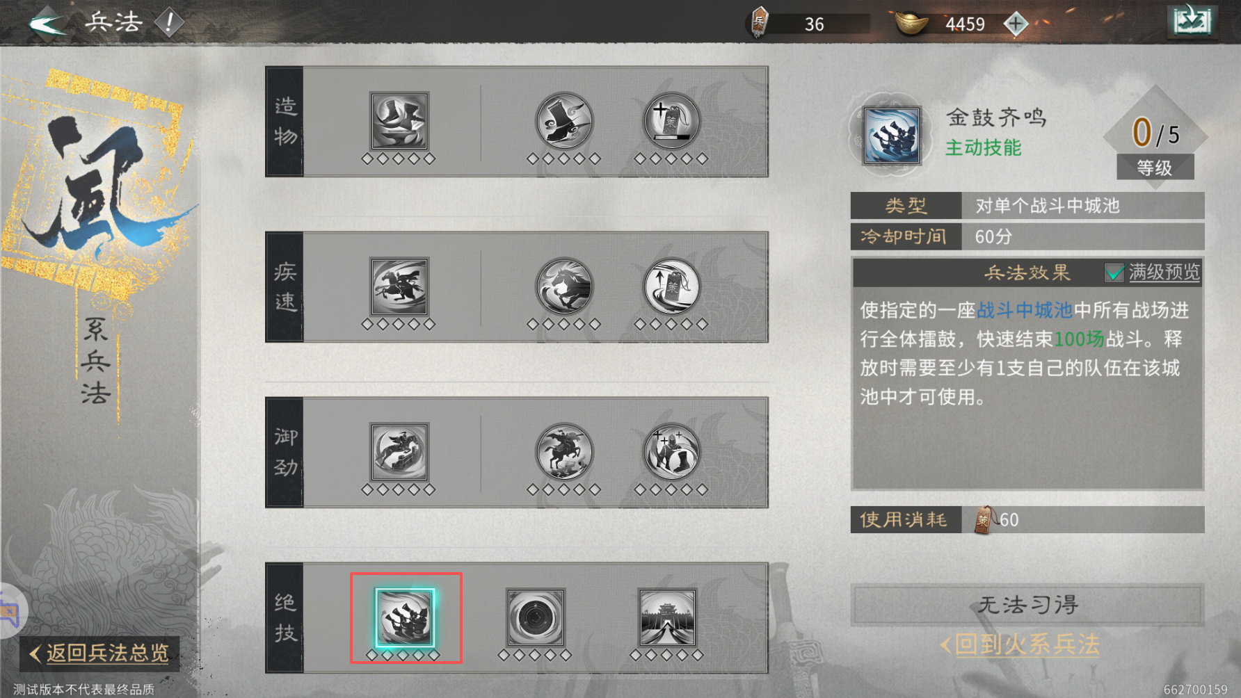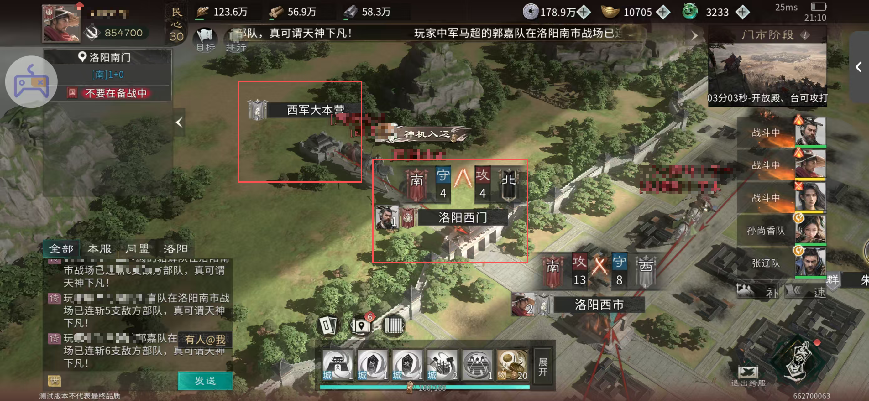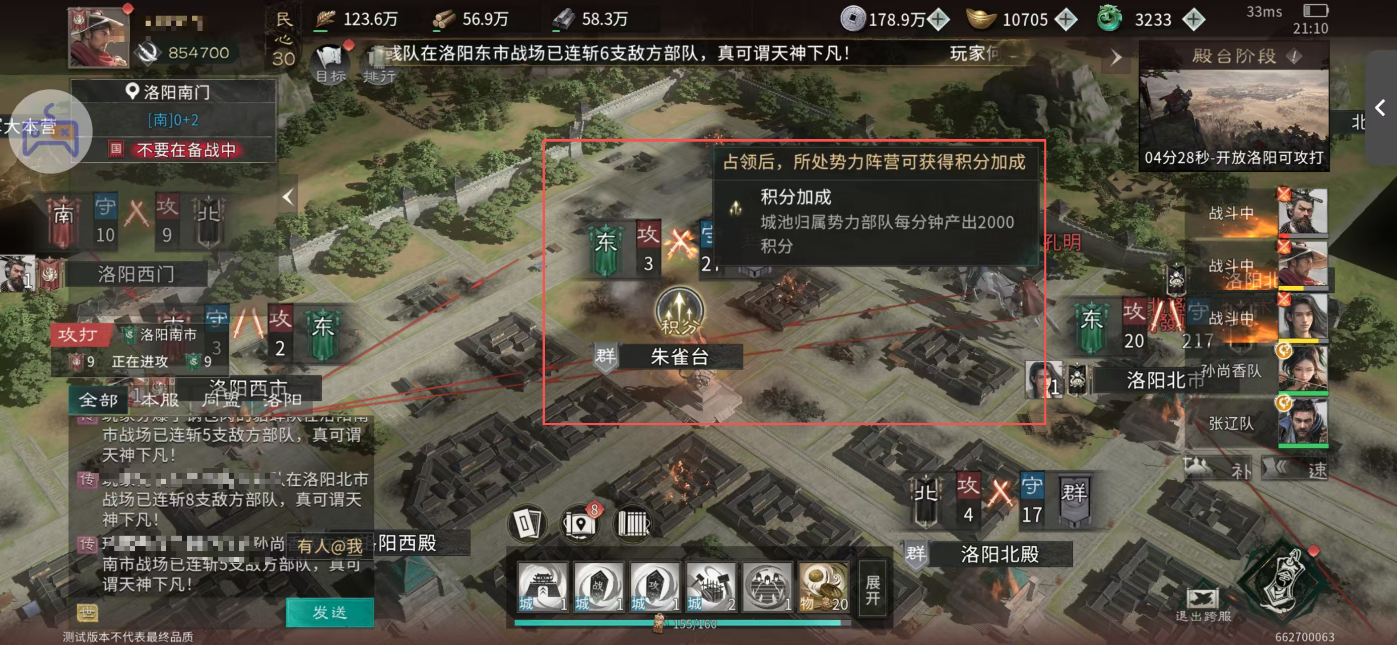 2.在准备阶段,可专门选派一名盟友学习火系兵法绝技【兵临城下】,以便开局后直接传送至关键积分城。其余盟友则需迅速跟进支援,并配合使用风系兵法绝技【金鼓齐鸣】,全力抢占该城池。成功夺取积分城能为己方赢得宝贵的先手优势,从而显著提升决战洛阳的整体胜率。