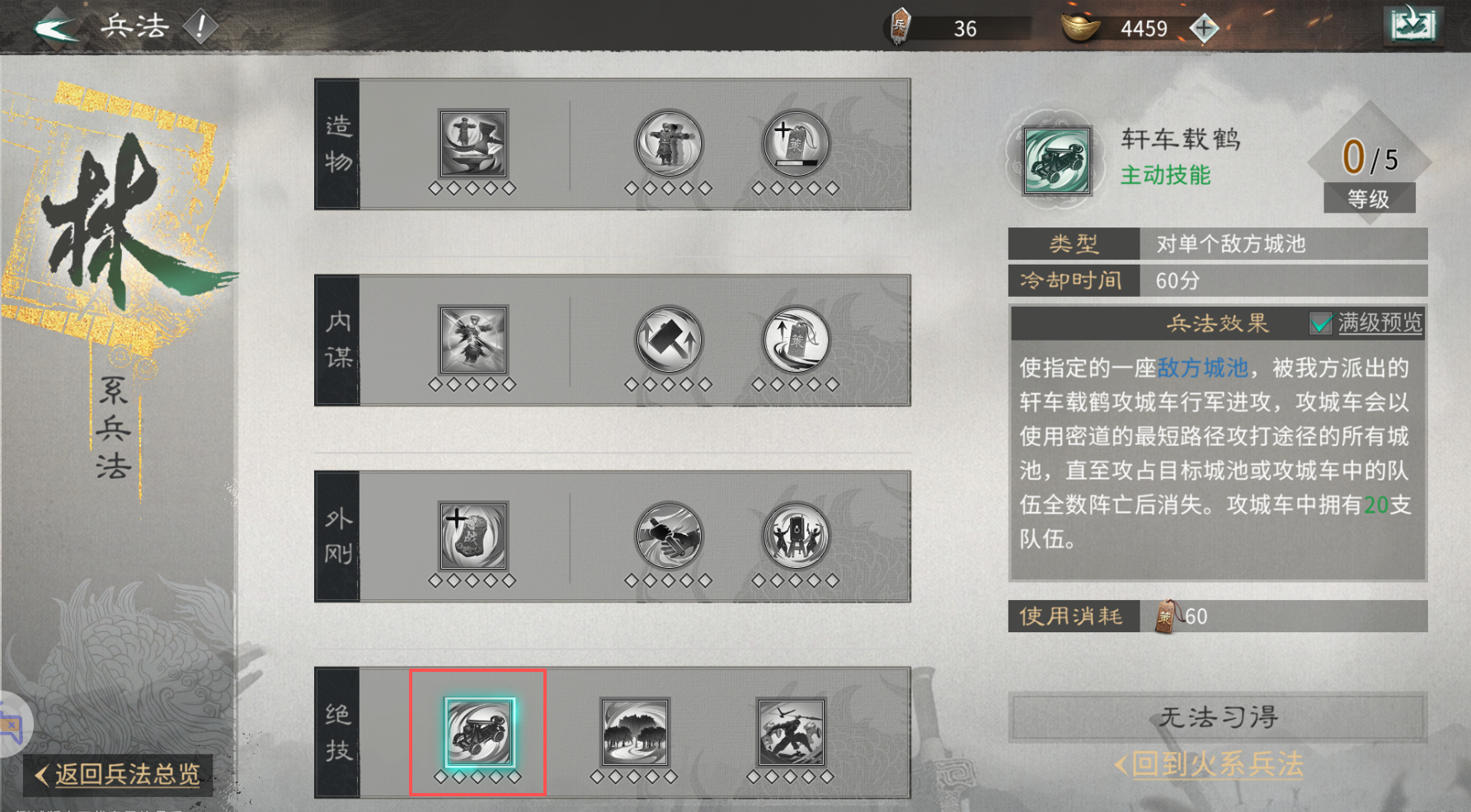 5.我们可以指派部分盟友专精林系兵法,利用林系兵法绝技【轩车载鹤】召唤攻城车部队,用于阻截敌方的推进。