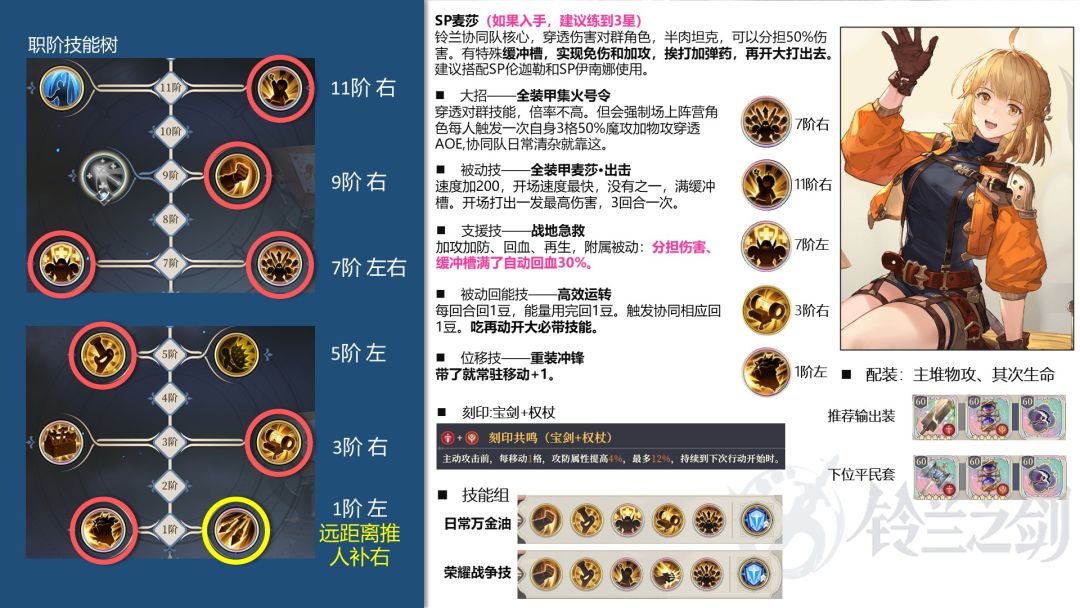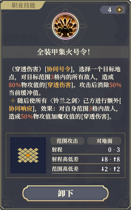 接下来我们看技能。首先大麦的7阶右的大招集火号令,这是大麦的核心输出技能。最大的特点是,开这个技能的时候,全场所有协同队友,都会触发一个自身范围3格的,50%魔攻加物攻的穿透伤害。要打出这个效果,需要跟敌人纠缠在一起。SP伦妹和小王很容易。因为大麦自己腿短,走位笨重。