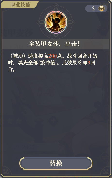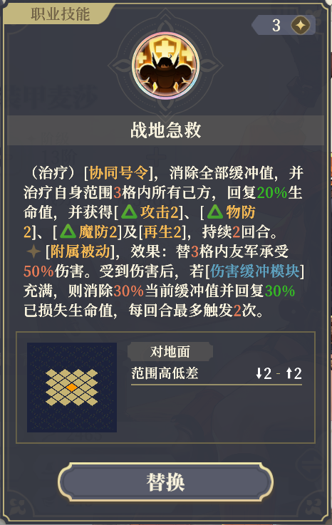 第三个技能是战地急救,这是一个被绝大部分玩家所忽略的技能。这个技能带上就能为队友分担50%伤害,同时当大麦自身缓冲槽满了之后,可以立刻扣除30%缓冲值并回血30%。主动使用,还能给团队加攻2加防御和再生效果,非常强力的保人技能。
