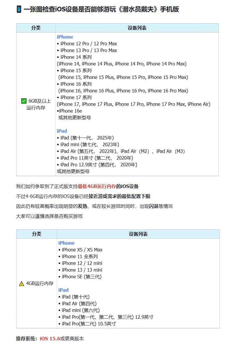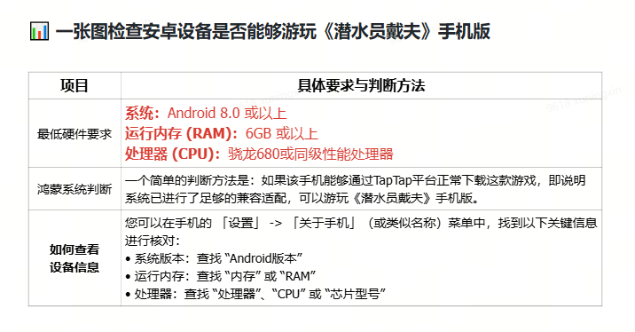 在官宣2月6日发售的同时,我们也和大家分享了游戏的最低支持配置,并为方便大家检索自己的手机或平板配置是否足够玩《潜水员戴夫》手机版,制作了快速检索图给大家: