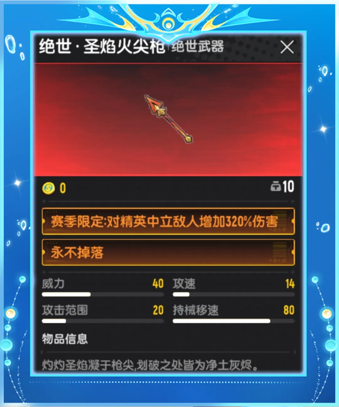 新登场的「绝世·圣焰火尖枪」赛季限定词条为,对精英中立敌人增加320%伤害