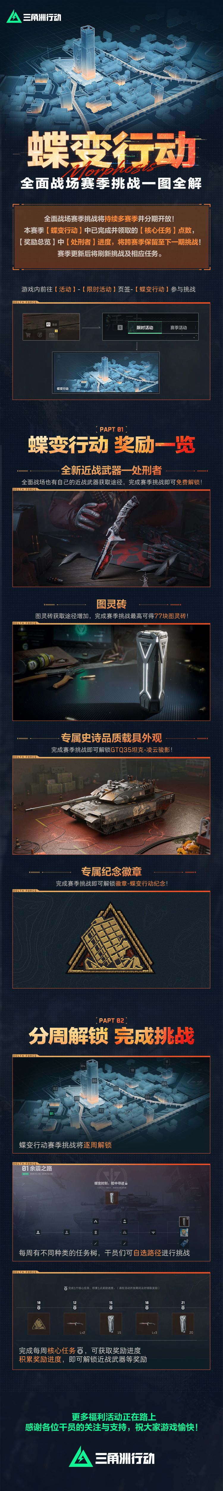 参与挑战即可免费解锁可升级传说近战武器 - 处刑者、GTQ35坦克-凌云骏影、徽章-蝶变行动纪念等奖励!