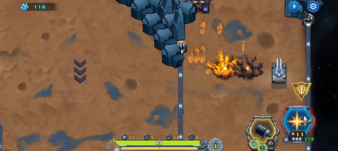我们要注意的是,爆出的资源,留着最后见到BOSS再释放。因BOSS可以释放跟踪导弹,所以我们要运用好激光枪射程远的特点,与BOSS周旋,需要控制好摇杆操作的节奏感,基本上压力不大,就可以过关。