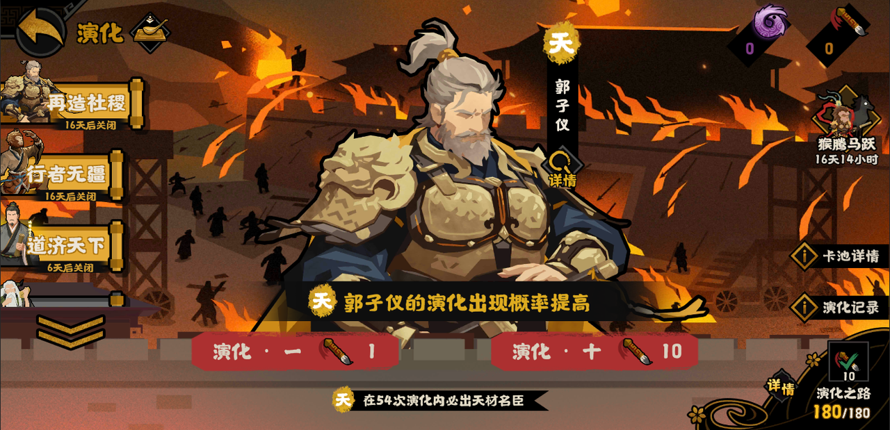 与此同时,郭子仪的卡池将于2月13日上线哦!2月13日至3月1日 ,全新天材名臣——郭子仪,演化概率限时上升!