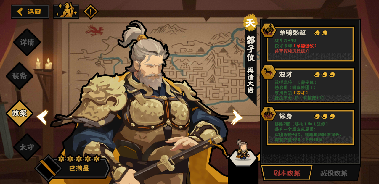 与此同时,施行郭子仪“宏才”技能后,将获得武将【郭子仪】,若启用【国家集团】,可用兵法【宏才】,行政压力-10、和谐度+10;