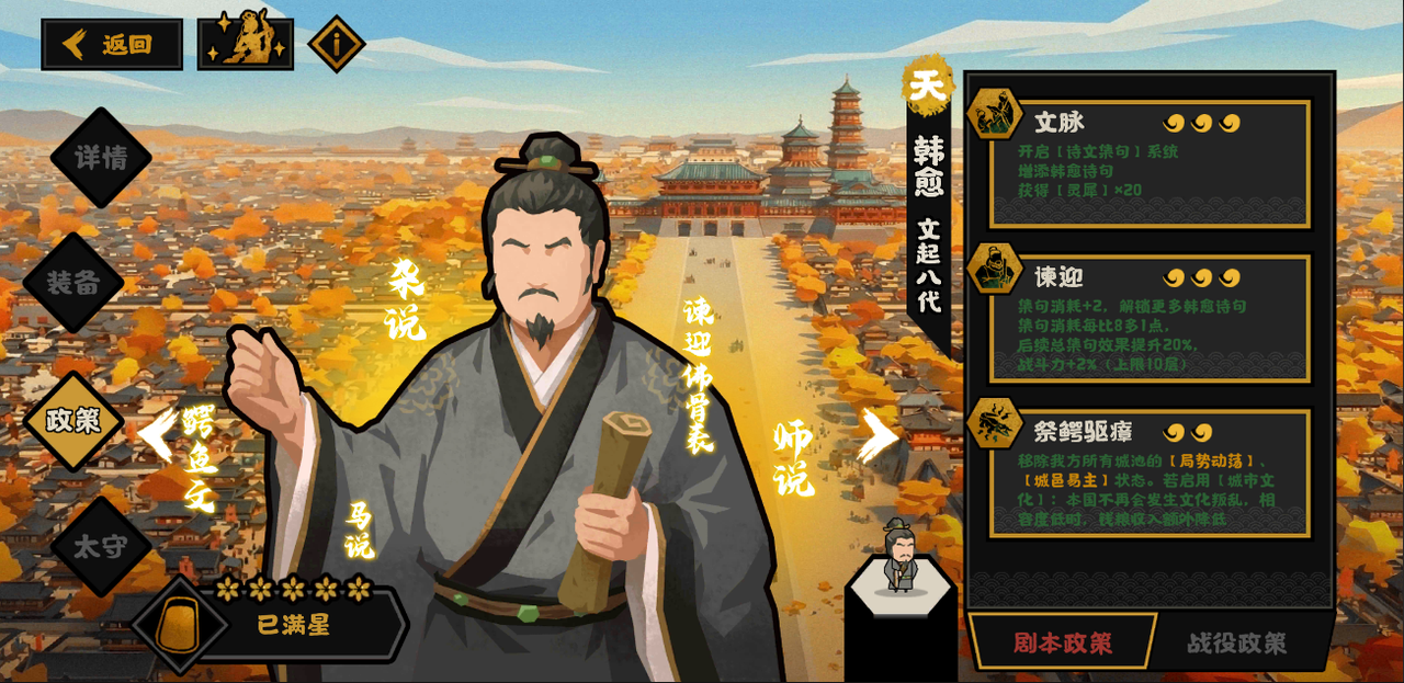 施行韩愈“祭鳄驱瘴”技能后,可移除我方所有城池的【局势动荡】、【城邑易主】状态。若启用【城市文化】:本国不会再发生文化叛乱,相容度低时,钱粮收入额外降低。