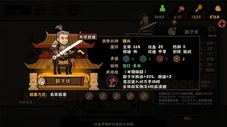 施行郭子仪“单骑退敌”技能后,战斗力+40,并获得卡牌【单骑退敌】,兵甲钱粮消耗提升;